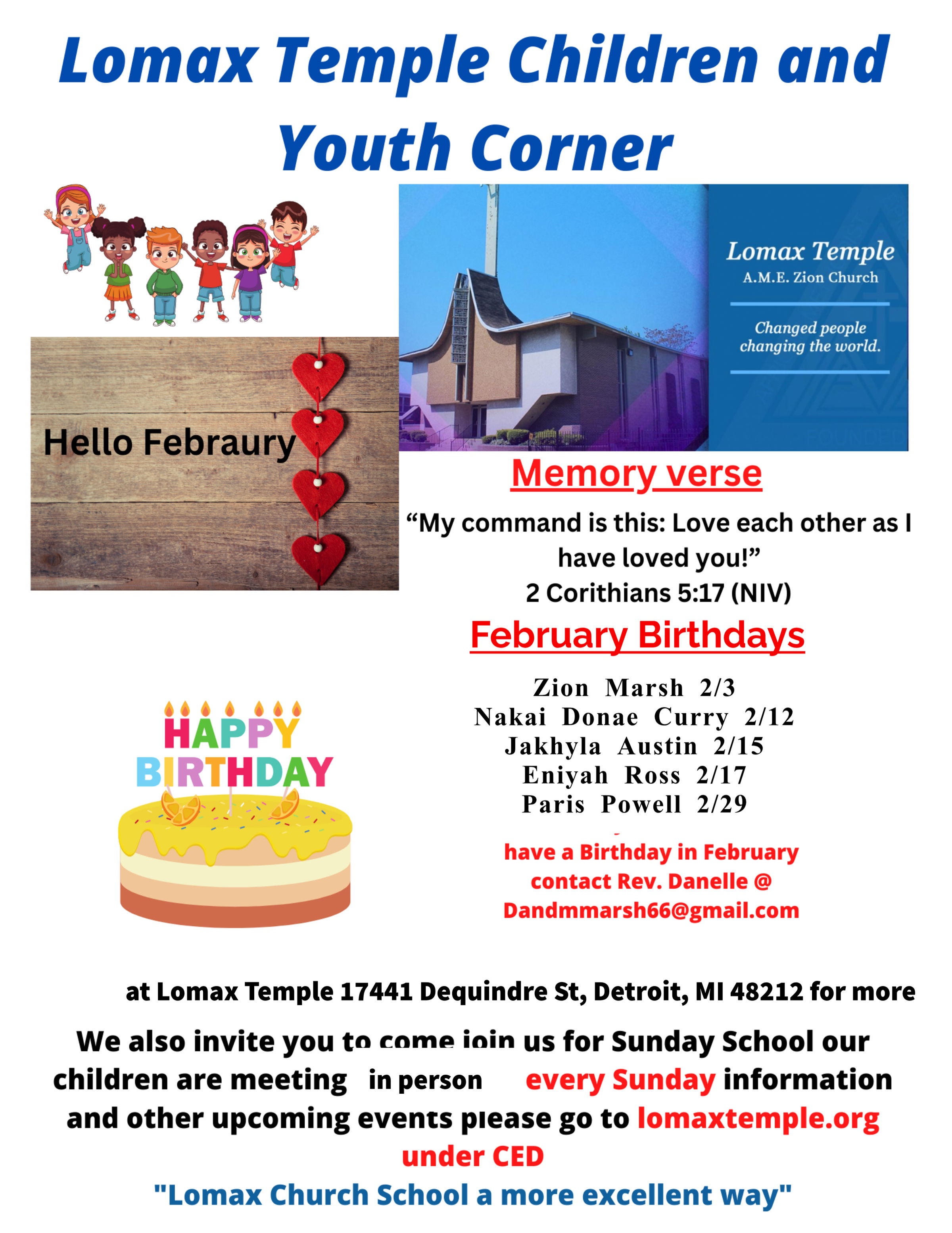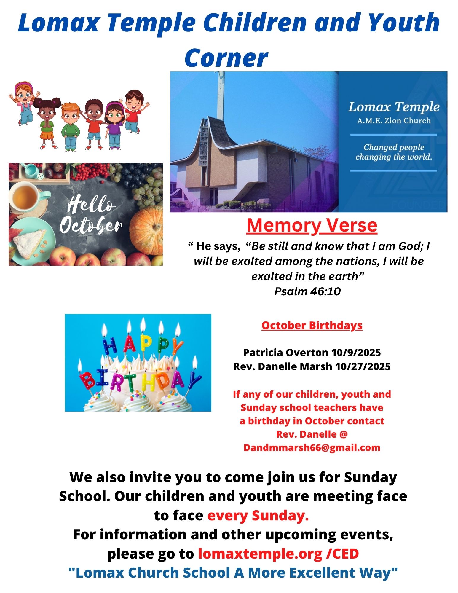 Our Lomax Temple Christian Educators strive to be a local resource for the development of credible, committed Christian disciples with a specific emphasis on discipleship with African-Americans and those throughout the African diaspora. The department includes contexts for all ages including Varick's Children, youth, young adult and adult ministries.
